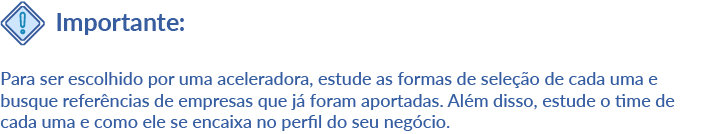 Uma aceleradora possui um processo de seleção bastante rígido, focado em escolher os melhores empreendedores e negócios de maior potencial, mesmo que não existam muitos dados e histórico sobre a empresa.