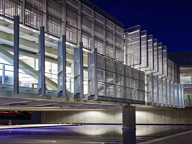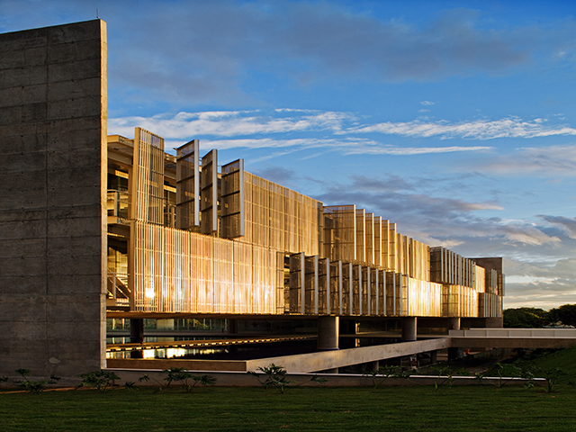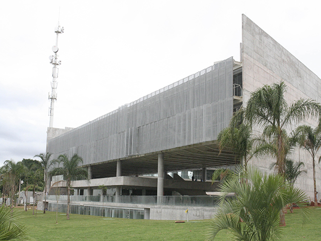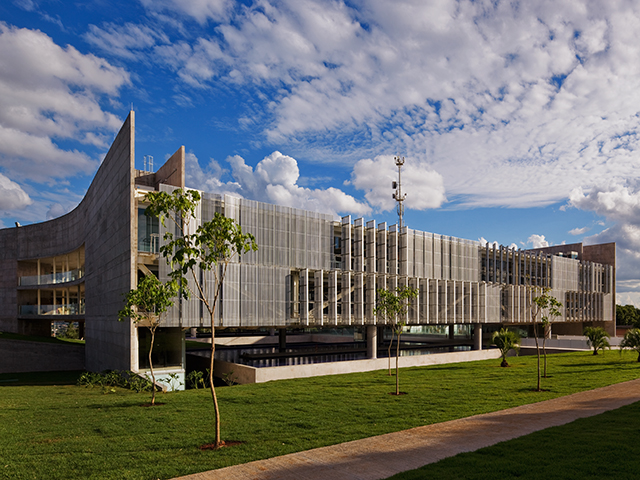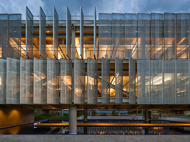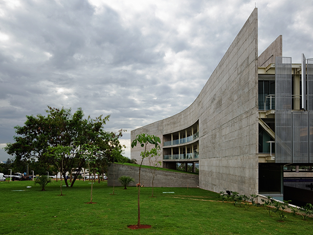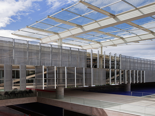 Os painéis metálicos, também chamados de quebra-sóis, garantem a integridade do conjunto, que tem estruturas aparentes propositadamente.