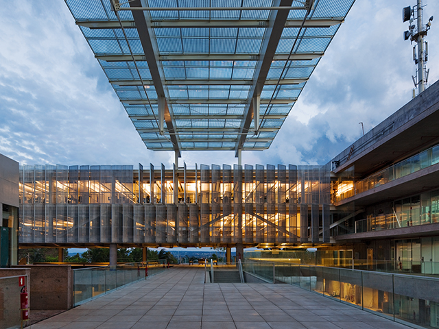 O edifício contrasta a cor natural dos materiais utilizados, o branco da estrutura metálica, o azul do céu e o verde da paisagem envoltória.