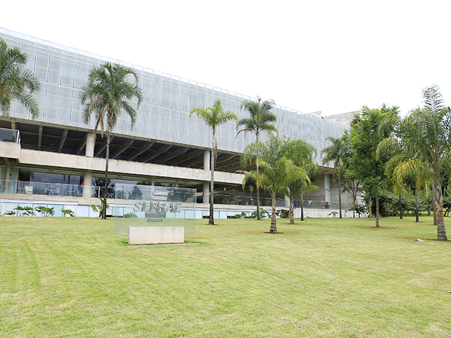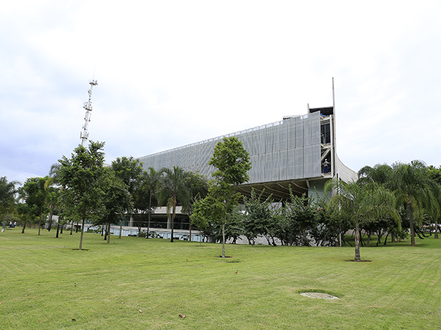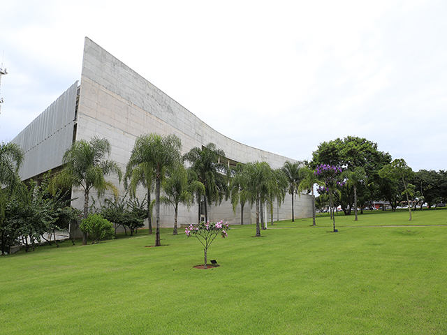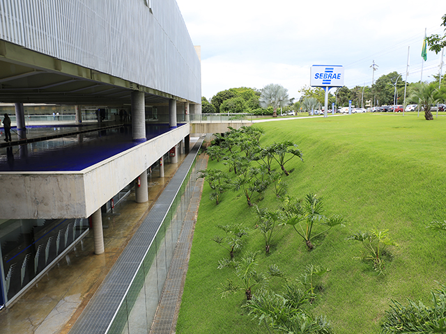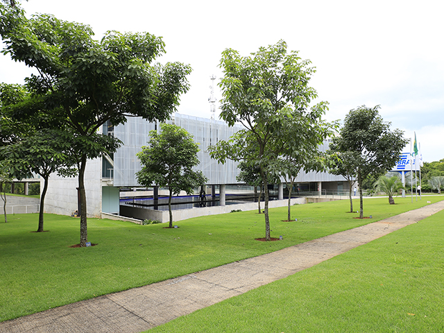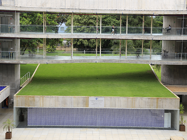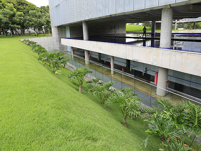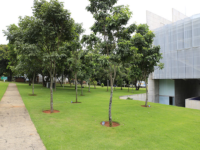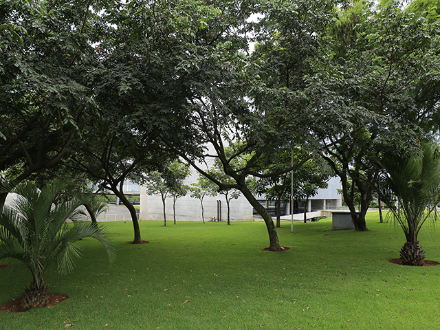 O projeto de paisagismo é o componente que faz o nexo entre o ambiente construído e o natural. A vegetação arbórea existente no entorno define o limite visual e é incorporada ao projeto, além de contribuir para o isolamento térmico desejável para o edifício.